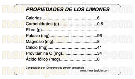 Entre las propiedades de los limones destaca que son las frutas de menor valor calórico. Destaca su contenido en vitamina C, ácido cítrico y sustancias de acción astringente. El componente mayoritario de los limones es el agua.
