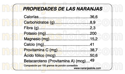 De las propiedades de las naranjas, debemos destacar su escaso valor energético, gracias a su elevado contenido en agua y su riqueza de vitamina C, ácido fólico y minerales como el potasio, el magnesio y calcio. Este último componente que se encuentra en las naranjas apenas se absorbe por el organismo.