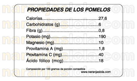 En cuanto a las propiedades de los pomelos, el agua es el principal componente de este cítrico, por lo que el pomelo posee un escaso valor calórico, a expensas básicamente de los carbohidratos.